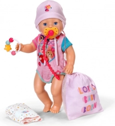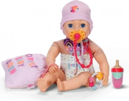 Kompletny zestaw akcesoriów do opieki nad lalką BABY BORN w rozmiarze 43 cm. Zawiera butelkę, czapeczkę, pieluszkę, śliniaczek, grzechotkę, smoczek i łańcuszek do smoczka – wszystko w nowoczesnych kolorach do stylowej zabawy. Magiczny smoczek w wybranych lalkach pomaga zamykać oczy i można go ozdobić przypinanymi dekoracjami (nie wchodzą w skład zestawu). Idealny do zabaw w odgrywanie ról opiekuńczych oraz rozwijania motoryki małej.