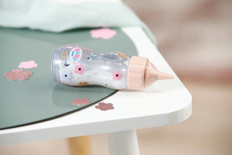 Zawartość buteleczki podczas „karmienia” znika, a po odstawieniu ponownie się pojawia – realistyczna zabawa bez rozlewania.