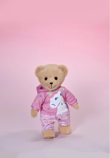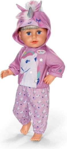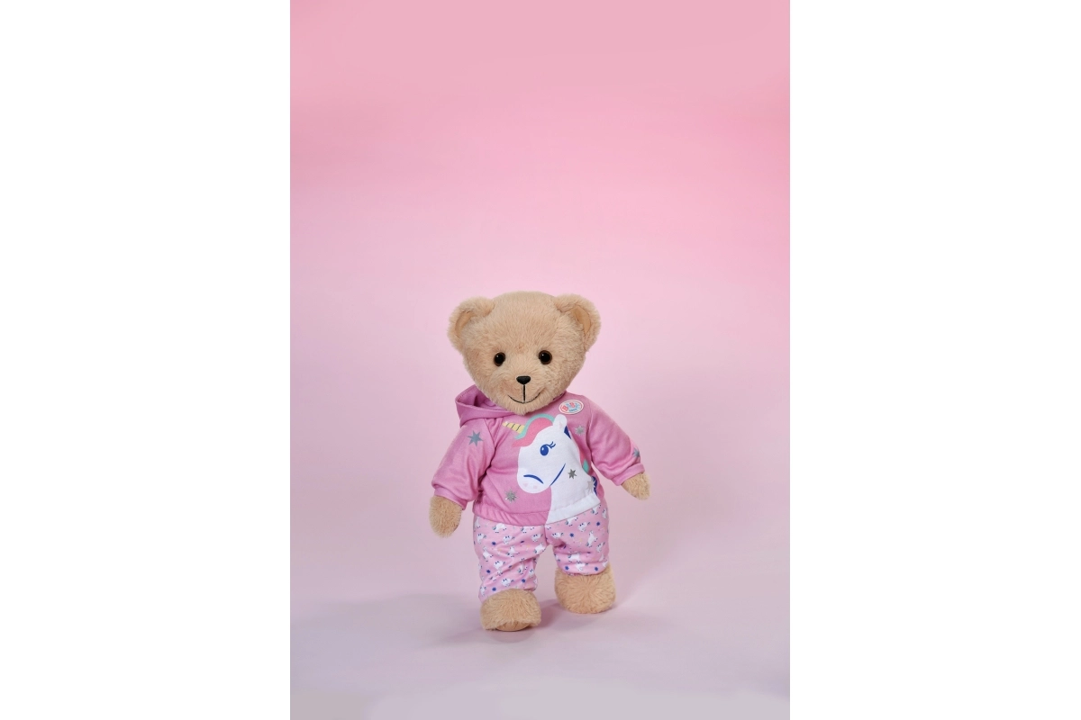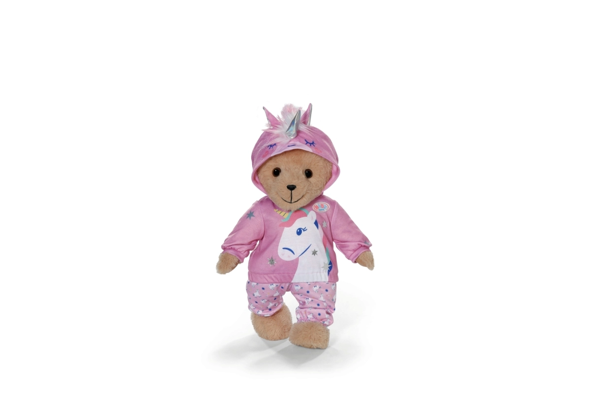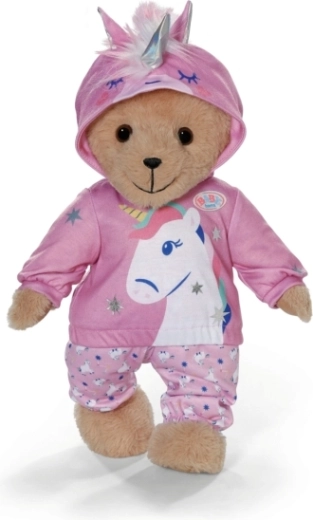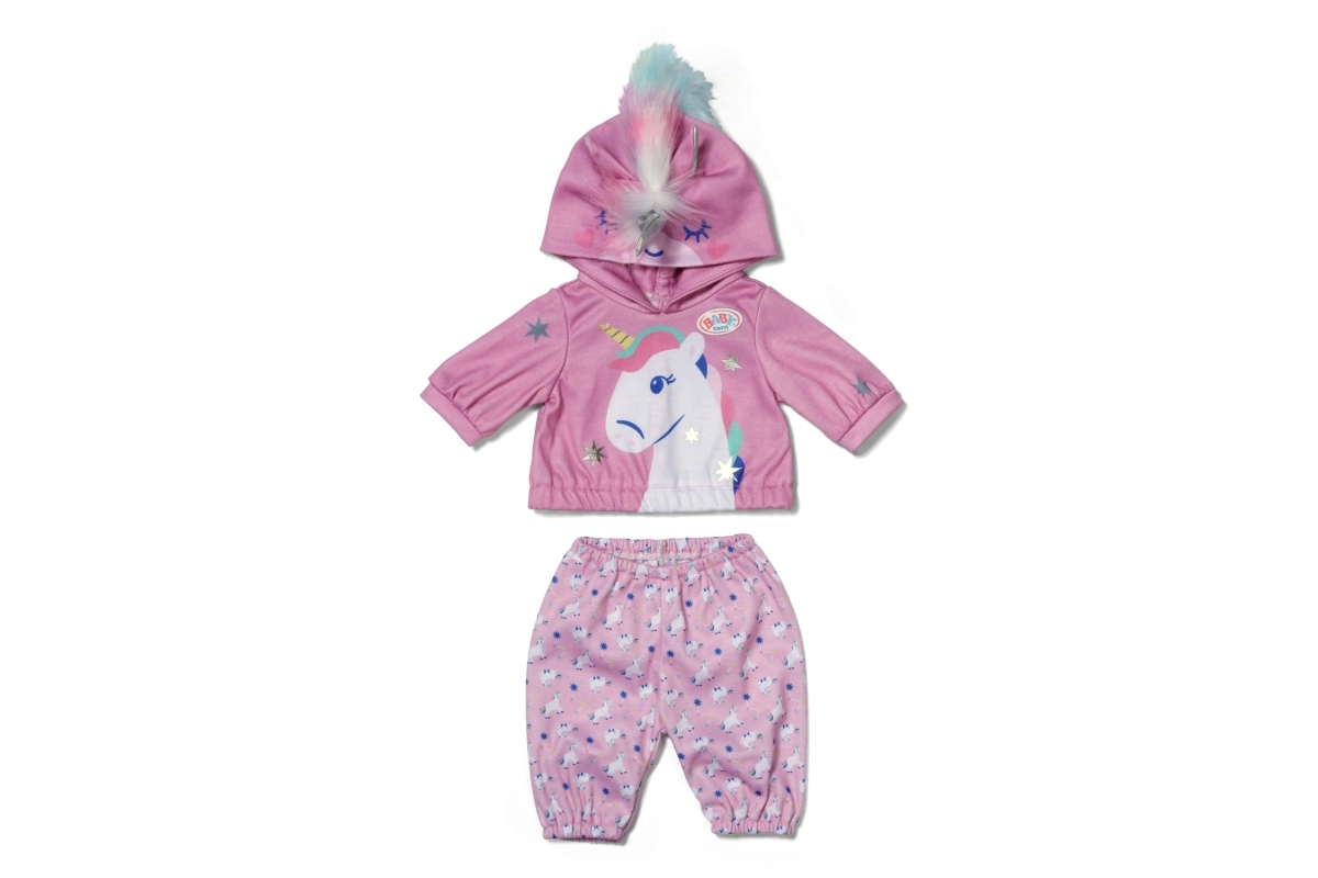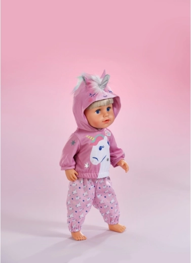 Stylowy strój z jednorożcem zmieni każdą lalkę w bajkowego przyjaciela. Mięciutka bluza z kapturem z rogiem i uszkami oraz dopasowane spodnie we wzór jednorożców wspierają kreatywną zabawę, opowiadanie historii i rozwój motoryki małej dzięki łatwemu przebieraniu.