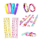 Odkryj modę i tworzenie w jednym opakowaniu. Zestaw DIY bransoletek zawiera 4 regulowane gumowe bransoletki, które łatwo dopasować do różnych rozmiarów nadgarstków. Dzięki bogatemu zestawowi zawieszek o różnych kształtach, wzorach i napisach oraz kolorowym naklejkom dzieci stworzą niepowtarzalne kompozycje dokładnie według własnej wyobraźni.