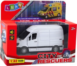 - metalowy van 1:32 z napędem pull-back, 3× bateria AG13, oryginalne opakowanie