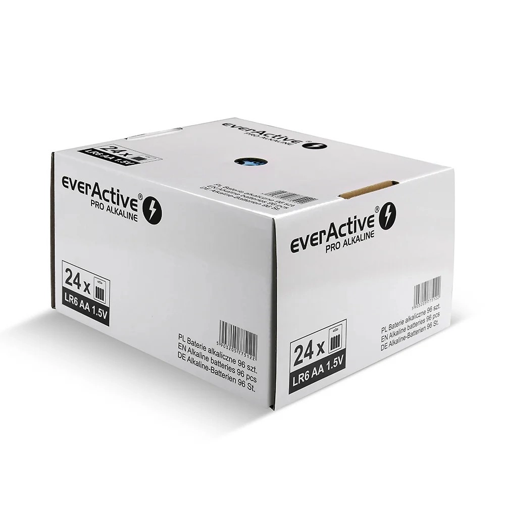Zestaw everActive PRO Alkaline to najbardziej wydajna linia baterii alkalicznych marki everActive w praktycznym opakowaniu typu display – 24 blistry po 4 sztuki, łącznie 96 baterii AA (LR6). Idealne do sprzedaży detalicznej, serwisów, firm oraz zastosowań profesjonalnych.