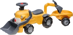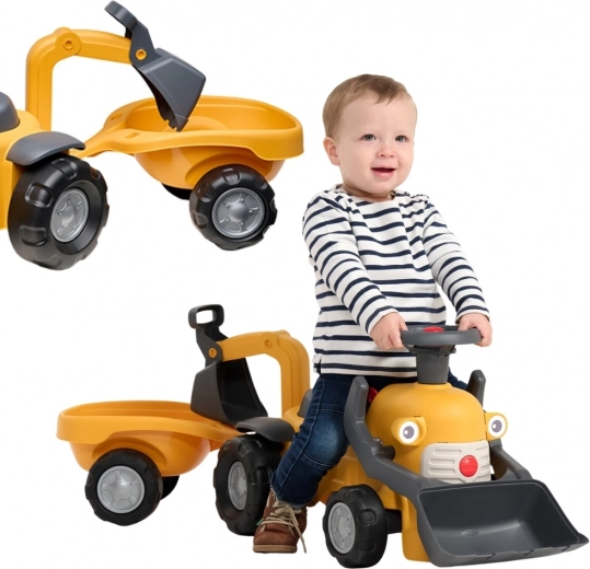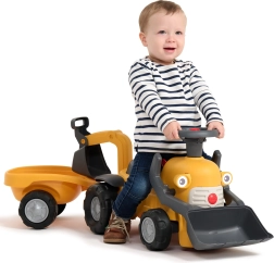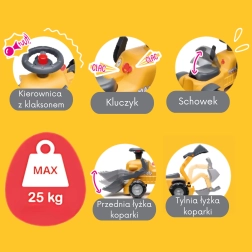 Odkryj pierwszy kompaktowy jeździk z prawdziwymi funkcjami koparki, łączący ruch i zabawę w odgrywanie ról. Dzieci pokochają nabieranie i wysypywanie drobiazgów dzięki przedniej łyżce, a tylna łyżka świetnie sprawdzi się przy załadunku odczepianej przyczepki. Obracana kierownica z klaksonem, klikający kluczyk i schowek pod siedzeniem gwarantują godziny kreatywnej zabawy.