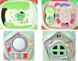Pianinko z dźwiękami instrumentów, sorter liczb i liter, sorter kształtów, przesuwane łamigłówki, zębatki, otwierane drzwiczki, telefon z klawiaturą, efekty świetlne i dźwiękowe