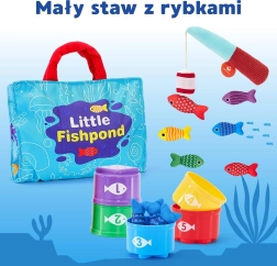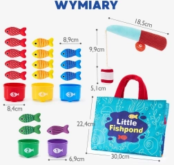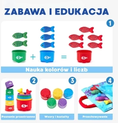 - 1 wędka, 15 rybek, 5 kubeczków, torba–mata