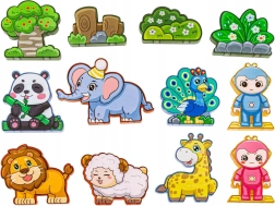 - Magnetyczne elementy o różnych kształtach, figurki zwierząt, figurki postaci, tematyczne dodatki (drzewo, skały), instrukcja