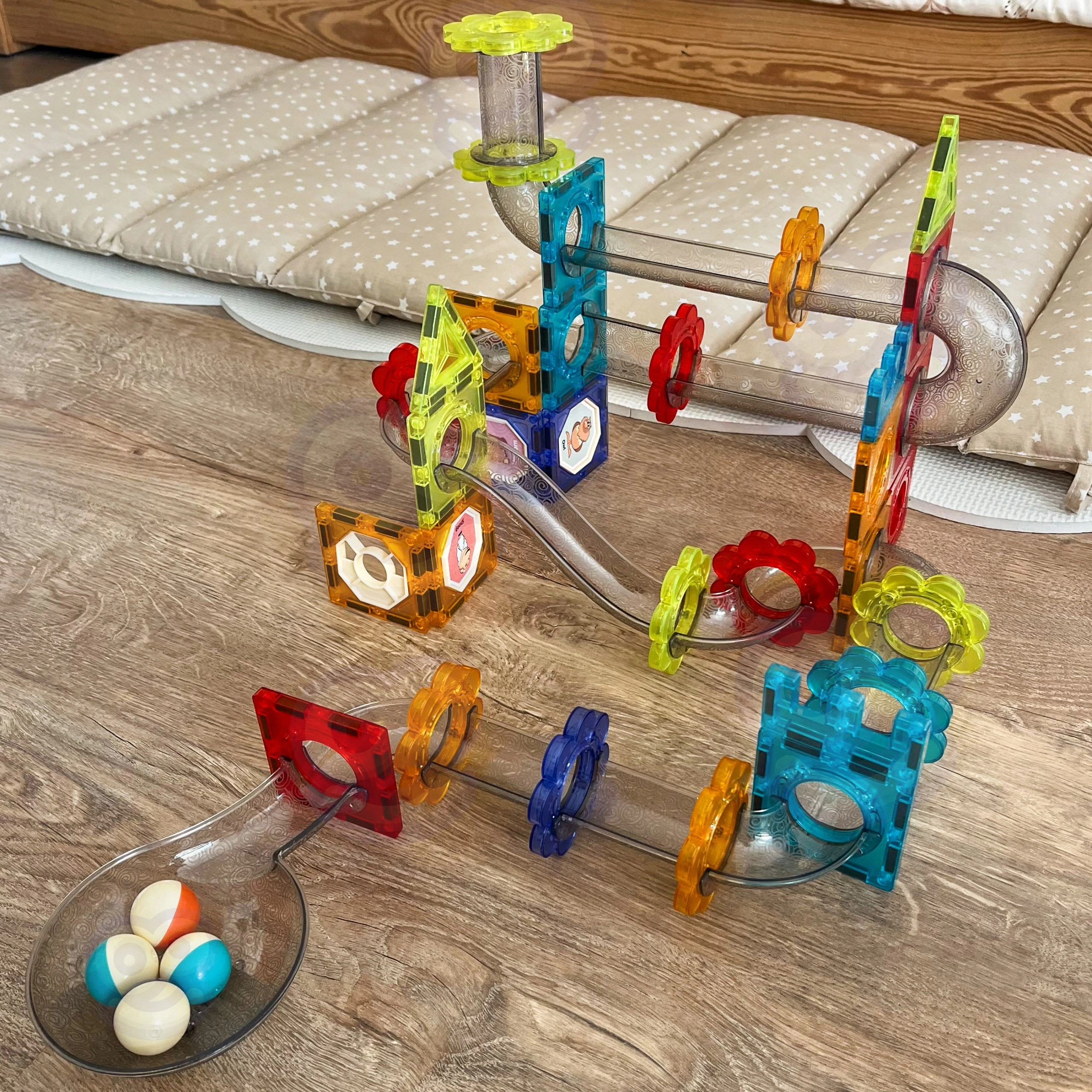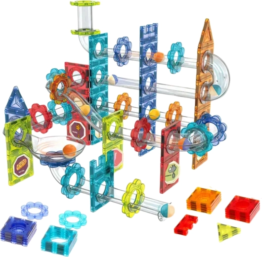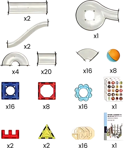 - Magnetyczne płytki o różnych kształtach i kolorach; przezroczyste elementy toru (rynny, zakręty, leje, tunele); kolorowe kulki; dekoracyjne naklejki; ilustrowana instrukcja