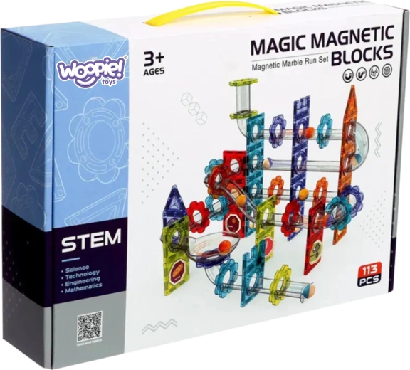 Odkryj świat tworzenia i fizyki z kreatywnym zestawem konstrukcyjnym WOOPIE: magnetycznym torem kulkowym z 113 elementami. Przezroczyste rurki, kolorowe płytki i silne magnesy pozwalają budować stabilne, wielopoziomowe trasy, na których dzieci w praktyce poznają grawitację i ruch. Idealny do rozwoju logicznego myślenia, wyobraźni przestrzennej i motoryki małej – godziny wartościowej zabawy dla dzieci od 3 lat.