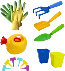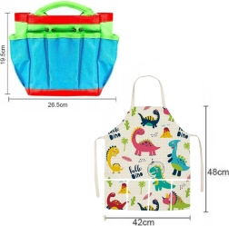 konewka w kształcie kwiatka, rękawice ogrodnicze, łopatka, szufelka/łopatka, grabki, 2 doniczki (pomarańczowa i żółta), 6 kolorowych znaczników do roślin, torba na narzędzia, ochronna fartuszka z dinozaurami
