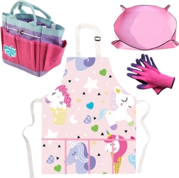 - fartuszek ogrodnika, torba na narzędzia z kieszeniami, rękawice ochronne, łopatka ogrodowa, szufelka/łopatka, grabki, spryskiwacz, 3 doniczki, 6 znaczników do roślin, mata do przesadzania, figurka jednorożca