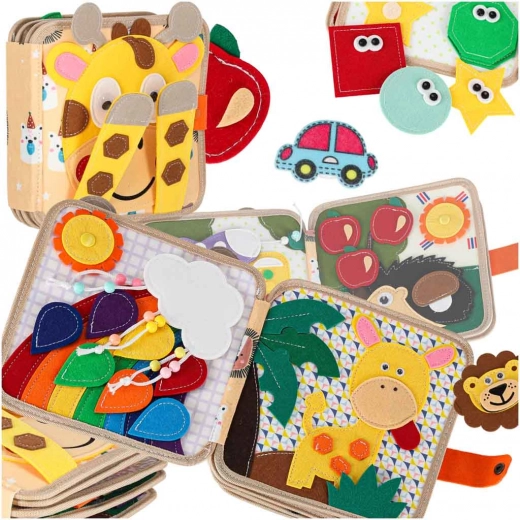Odkryj wesołą filcową książeczkę, która rozwija małą motorykę, wyobraźnię oraz poznawanie kolorów i kształtów. Dzięki miękkim elementom sensorycznym, odpinanym częściom na rzep i napy oraz praktycznemu formatowi w podróż dzieci ją pokochają. Wesoła żyrafa prowadzi dziecko przez strony pełne aktywności wspierających naukę przez zabawę.