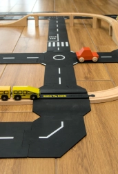 Mały, ale sprytny zestaw dla wszystkich miłośników pociągów i aut. Innowacyjny element przejazdu kolejowego łączy drogi Miasto lub Metropolia z drewnianymi torami (np. BRIO, MAXIM), dzięki czemu autka mogą bezpiecznie przejeżdżać przez ulubione tory. Silikon spożywczy gwarantuje trwałość, elastyczność i łatwą pielęgnację, także podczas zabawy na zewnątrz.