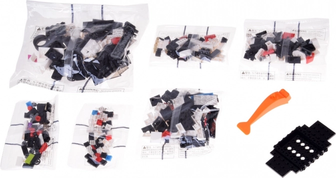 Techniczny zestaw supersamochodu w białym kolorze z efektownym czarno‑czerwonym pasem od maski przez dach aż po spojler zapewnia świetne wrażenia z budowania i imponujący model końcowy. Długie proporcje, niskie nadwozie i masywne błotniki podkreślają muskularny, wyścigowy charakter.