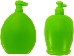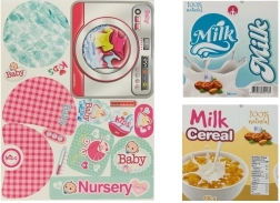 Zabawkowe kosmetyki, mydelniczka, pojemnik na puder, mydła w płynie, zabawkowe sztućce dla niemowlęcia, pudełkowe „mleko”, pudełkowe „płatki śniadaniowe”, zestaw naklejek