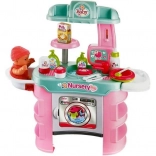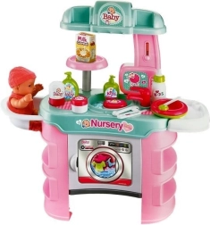 Podaruj dzieciom realistyczną zabawę w rodziców z zestawem do opieki nad niemowlęciem. W komplecie znajdują się stolik z pralką, umywalka z kranem, siedzisko dla lalki oraz praktyczne półki. Bogate akcesoria, takie jak kosmetyki dla niemowląt, zabawkowe sztućce i pudełkowe produkty spożywcze, wspierają wyobraźnię i rozwój umiejętności.