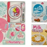 - Zabawkowe kosmetyki, mydelniczka, pojemnik na puder, mydła w płynie, zabawkowe sztućce dla niemowlęcia, pudełkowe „mleko”, pudełkowe „płatki śniadaniowe”, zestaw naklejek