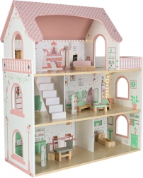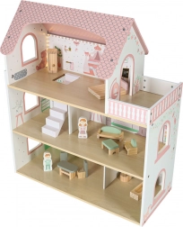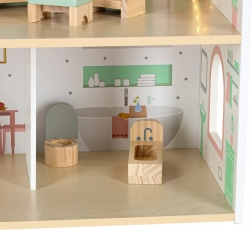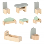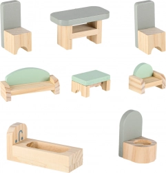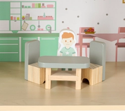 W komplecie łóżko, szafka, zestaw wypoczynkowy, stół z krzesłami oraz wyposażenie łazienkowe. Dwie drewniane figurki zachęcają do zabaw w odgrywanie ról i rozwijają kreatywność.