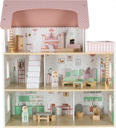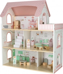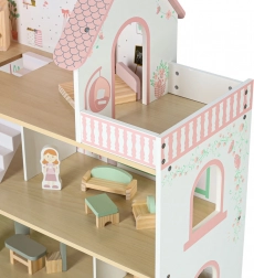 Wytrzymała konstrukcja z płyt MDF, gładkie krawędzie i stabilne wykonanie zapewniają bezpieczną zabawę. Domek ma wysokość 70 cm, co czyni go idealnym do wspólnej zabawy rodzeństwa. Otwierana szafka, ruchome akcesoria i dwie drewniane figurki wspierają tworzenie pomysłowych historii i rozwój małej motoryki.