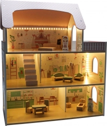 Domek dla lalek Lulilo Peonio to piękny, trzypiętrowy dom w różowo‑miętowej kolorystyce z nadrukami wnętrz, schodami i balkonem. Ciepłe światełka LED nadają wieczornej zabawie magiczną atmosferę i ocieplają każde pomieszczenie. Dzięki bogatemu zestawowi mebli dzieci łatwo urządzą sypialnię, salon, kuchnię i łazienkę.