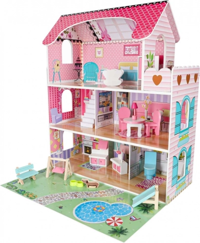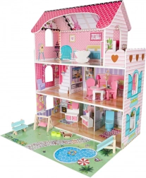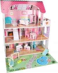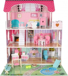 Trzy piętra, balkon, schody i ogródek z placem zabaw. Dzieci mogą swobodnie przestawiać meble i tworzyć nieskończone scenariusze zabawy.