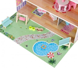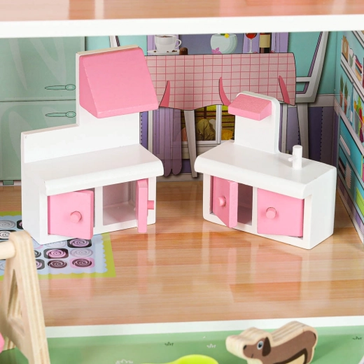 Bogate wyposażenie obejmuje stół, 2 krzesła, huśtawkę, toaletę, leżak, ławeczkę, łóżeczko dziecięce, lampę, miskę dla pieska, szafę, kuchenkę i umywalkę oraz uroczą figurkę pieska. Dzięki solidnej konstrukcji z MDF, plastikowym elementom i metalowym śrubkom domek jest stabilny i odporny na codzienną zabawę.