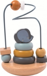 Koralikowy labirynt ze słoniem trenuje koordynację ręka–oko i chwyt, a tęczowe łuki pomagają porządkować według wielkości i budować kreatywne kształty.