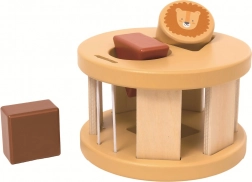Wytrzymały bęben do sortowania z obrotową pokrywką i motywem lwa uczy dzieci rozpoznawania i dopasowywania kształtów, wspiera koordynację i precyzję chwytu.