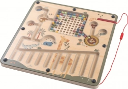 Ta drewniana magnetyczna plansza z uroczymi zwierzątkami jest idealna do zabawy w domu, w przedszkolu i w kącikach zabaw. Dzieci prowadzą kolorowe kuleczki frezowanymi ścieżkami za pomocą sznurka z przymocowanym magnetycznym długopisem – układają proste obrazki według 5 wzorów, przyporządkowują kuleczki do właściwych zwierzątek i segregują je do pojemników od najmniejszego do największego.