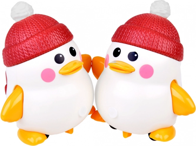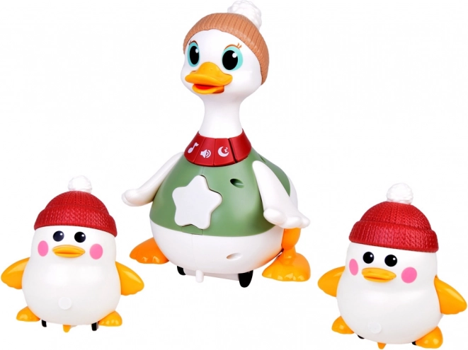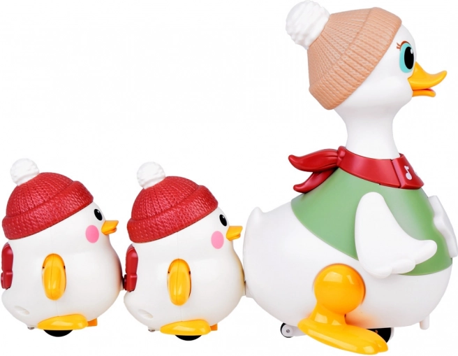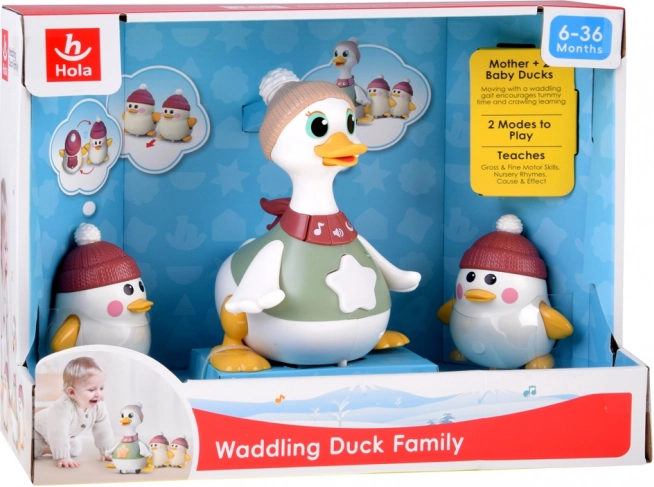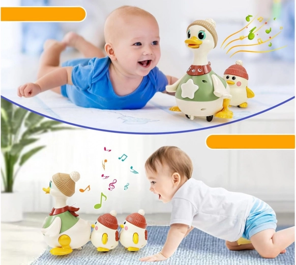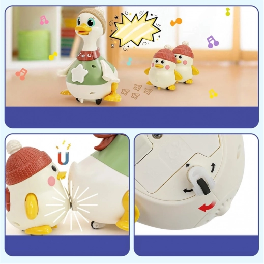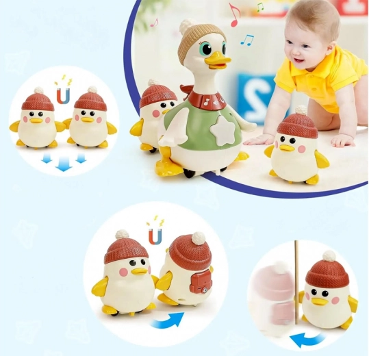 Urocza rodzinka kaczek ucieszy maluchy od 6 miesięcy. Mama kaczka z dwoma kaczątkami porusza się na kółkach, wydaje wesołe melodie, ma efekty świetlne i ruchomy dzióbek. Dzięki magnetycznemu połączeniu kaczątka podążają za mamą i tworzą pociąg, który motywuje dzieci do tarmoszenia, czołgania się i pierwszych kroczków.