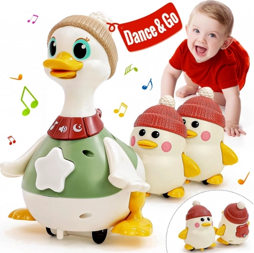 Odkryj interaktywną zabawkę, która wspiera dużą i małą motorykę, koordynację ręka–oko oraz rozumienie związku przyczynowo-skutkowego. Mama kaczka potrafi sama iść albo stać i śpiewać, przy czym porusza dzióbkiem, a na brzuszku świeci jej delikatna gwiazdka. Po dłuższej bezczynności sama przechodzi w tryb uśpienia, oszczędzając baterie.