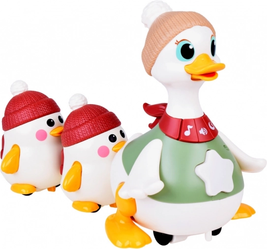 Mama kaczka odtwarza wesołe melodie, ma przycisk z kołysankami, regulację głośności oraz delikatnie świecącą gwiazdkę na brzuszku. Podczas śpiewu dzióbek się porusza.
