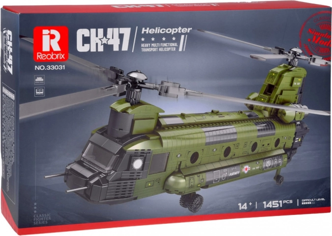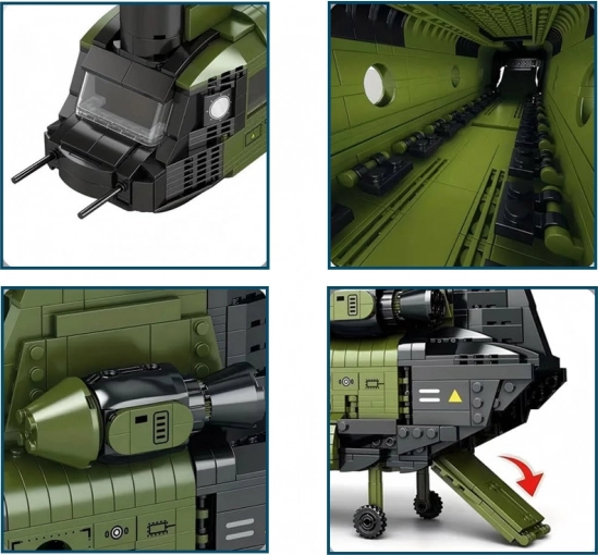 Ten szczegółowy model śmigłowca transportowego CH-47 CHINOOK marki Reobrix ucieszy fanów lotnictwa, techniki i militariów. Nacisk na realistyczne funkcje – od w pełni obrotowych tandemowych wirników, przez otwieraną rampę ładunkową, po dopracowane wnętrza – czyni z zestawu doskonały wybór dla budowniczych od 14 lat.