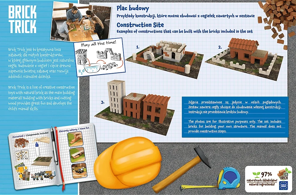 Zostań budowniczym i krok po kroku stwórz realistyczny plac budowy z naturalnych glinianych cegiełek. Każdą cegiełkę układasz jak w rzeczywistości, listewki można przycinać na wymiar, a dzięki klejowi rozpuszczalnemu w wodzie model można w każdej chwili rozłożyć i zacząć od nowa. Gotową konstrukcję ożywisz dołączonymi dekoracjami i papierowymi figurkami.
