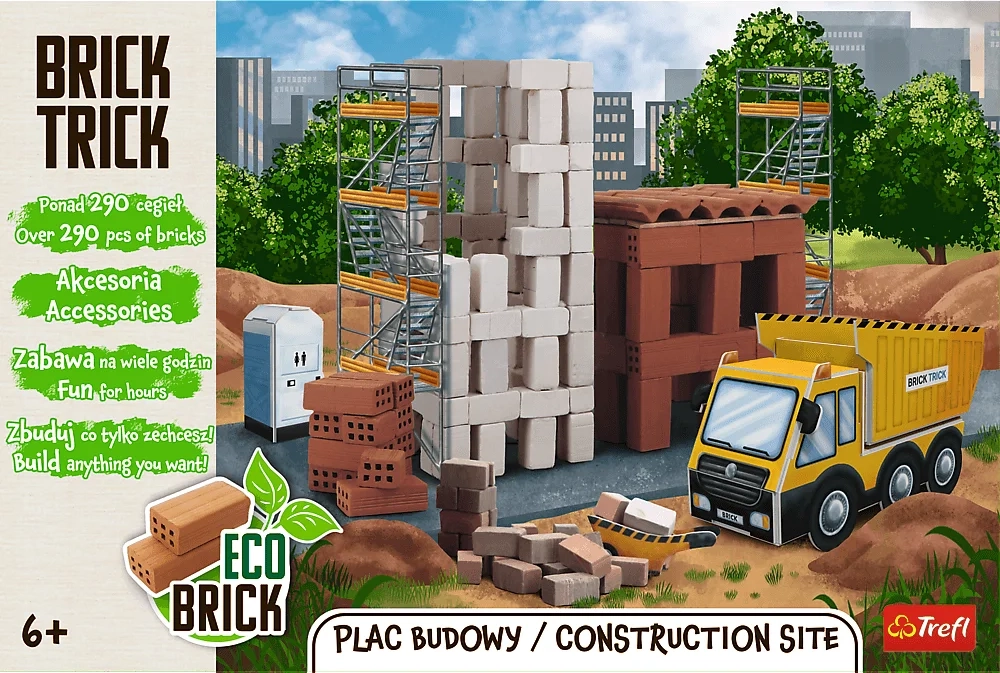 Zbuduj własny model budowli z prawdziwych glinianych cegiełek i drewna! Zestaw Trefl Brick Trick Plac budowy XL oferuje 290 elementów, które sklejisz klejem rozpuszczalnym w wodzie, uzupełnisz drewnianymi listewkami i ozdobisz dekoracjami. Budowanie według instrukcji lub własnej wyobraźni rozwija zdolności manualne, wymyślność i koncentrację.