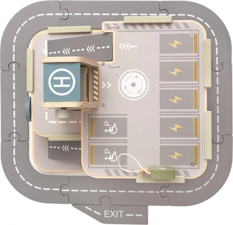 W opakowaniu znajdziesz wszystko, czego potrzeba do natychmiastowej zabawy – cztery autka, helikopter, trzy znaki drogowe, myjnię oraz dwa dystrybutory paliwa, z których jeden pełni funkcję ładowarki do samochodów elektrycznych. Bezpieczne, drewniane wykonanie i wytrzymała konstrukcja gwarantują długą żywotność nawet przy codziennej zabawie.