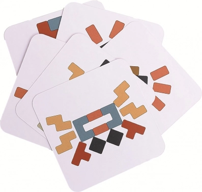 Zestaw sztywnych kart z kolorowymi wzorami prowadzi dzieci krok po kroku do rozwiązania. Świetne do rozwoju wyobraźni przestrzennej i planowania.