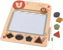 Ta wysokiej jakości drewniana magnetyczna tablica do rysowania z uroczym lwiątkiem zachwyci małych artystów. Magnetyczny długopis przymocowany sznurkiem się nie zgubi, a dzieci mogą bezpiecznie rysować obrazki, kształty i pierwsze literki. Suwak do czyszczenia z motywem lwiątka zapewnia szybkie usunięcie całego rysunku jednym ruchem.