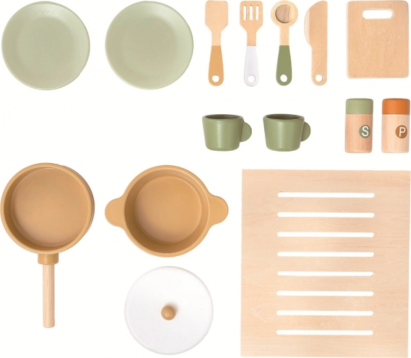 W zestawie znajduje się bogaty komplet akcesoriów: talerze, kubeczki, patelnia, garnek z pokrywką, sól i pieprz, deska do krojenia, przybory kuchenne oraz ruszt do piekarnika. Konstrukcja z solidnego drewna i nietoksycznych farb zapewnia bezpieczeństwo i długą trwałość.