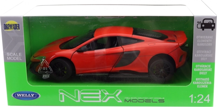 Precyzyjny model McLaren 675LT coupe w skali 1:24 łączy metalowe i plastikowe elementy, zapewniając wysoki realizm i trwałość. Dzięki oryginalnemu lakierowaniu model prezentuje się jak prawdziwy supersamochód w miniaturze i świetnie wygląda zarówno w gablocie, jak i na biurku.