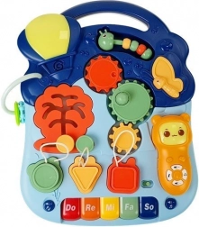 Obracane koła zębate, suwaki, kształty na sznureczkach i przyciski do wciskania trenują chwyt, koordynację ręka–oko oraz logiczne myślenie.