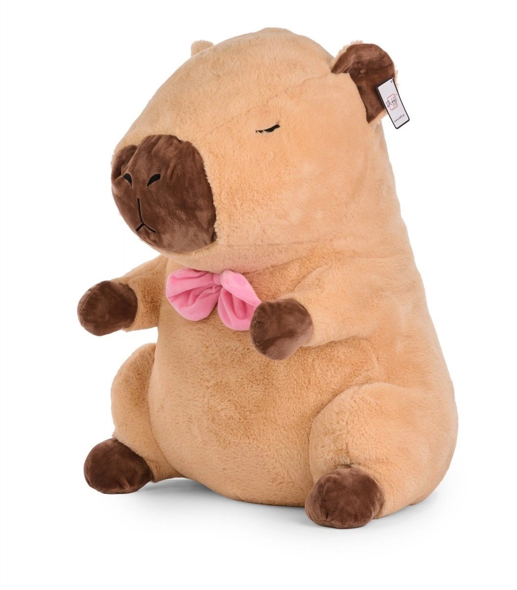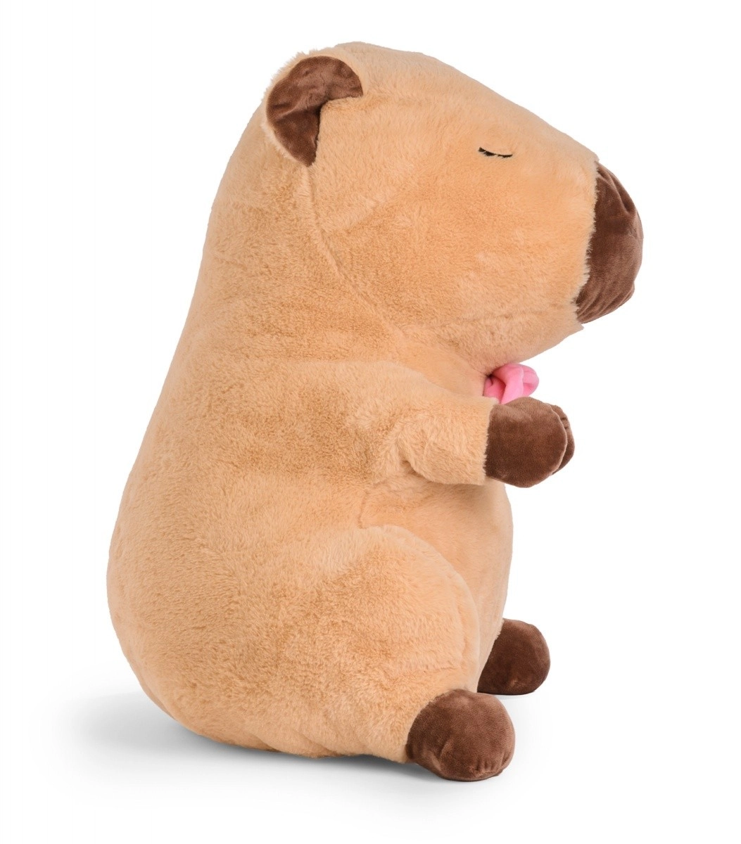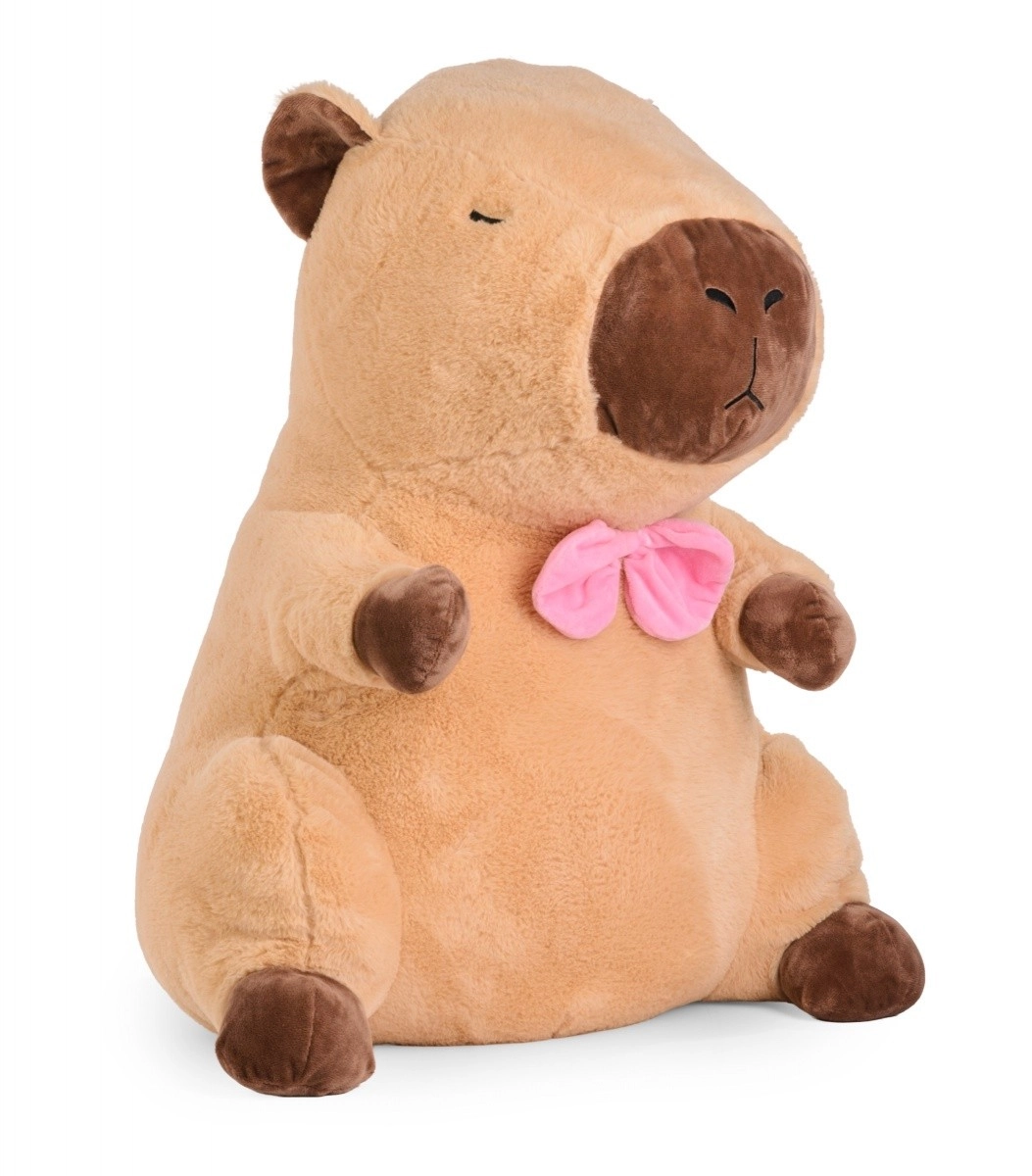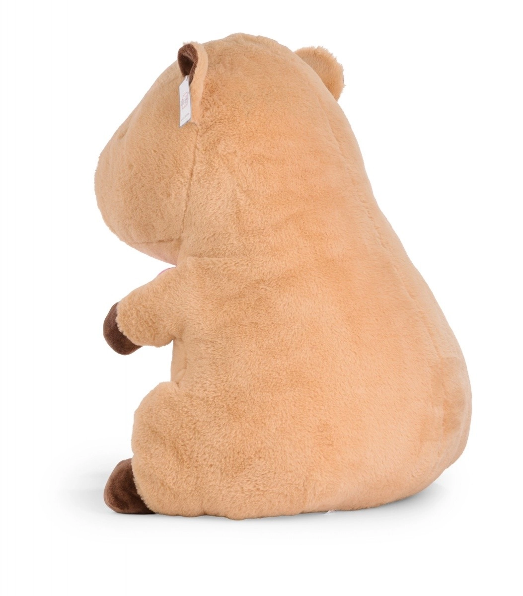 Ta duża pluszowa kapibara wnosi ciepłe przytulenie i stylowy akcent do pokoju dziecięcego oraz salonu. Miękki plusz, obłe kształty i różowa kokardka podkreślają jej uroczy wygląd, a haftowane oczy i pyszczek zapewniają bezpieczeństwo bez drobnych plastikowych części.