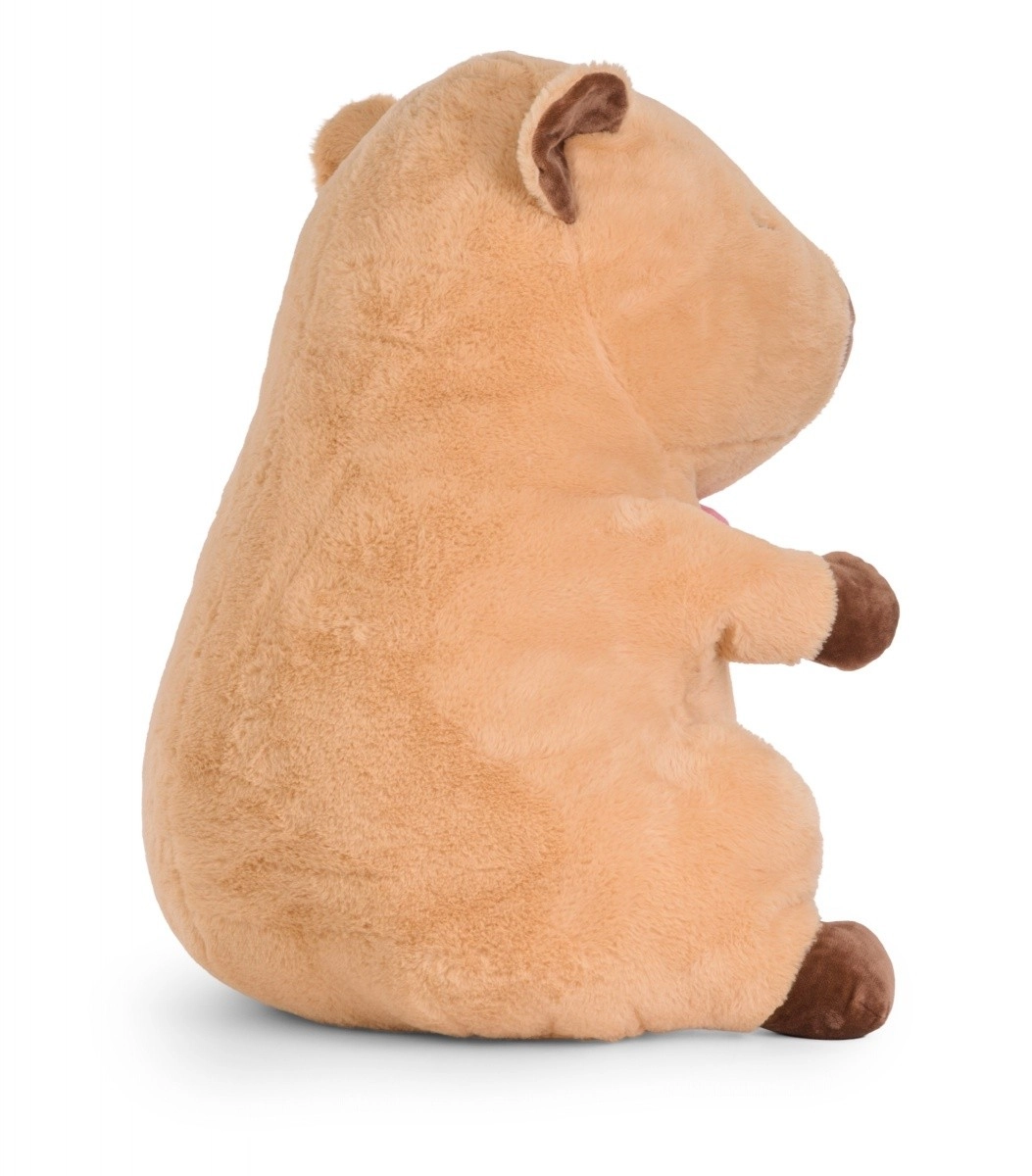 Urocza pluszowa kapibara o wysokości 66 cm ucieszy zarówno dzieci, jak i dorosłych. Wykonana z wyjątkowo miękkiego i w dotyku przyjemnego pluszu, zdobiona różową kokardą pod szyją i posiada starannie haftowane detale dla bezpiecznego przytulania. Naturalne, stonowane kolory oraz kojący wyraz czynią z kapibary idealną towarzyszkę do odpoczynku i relaksu.