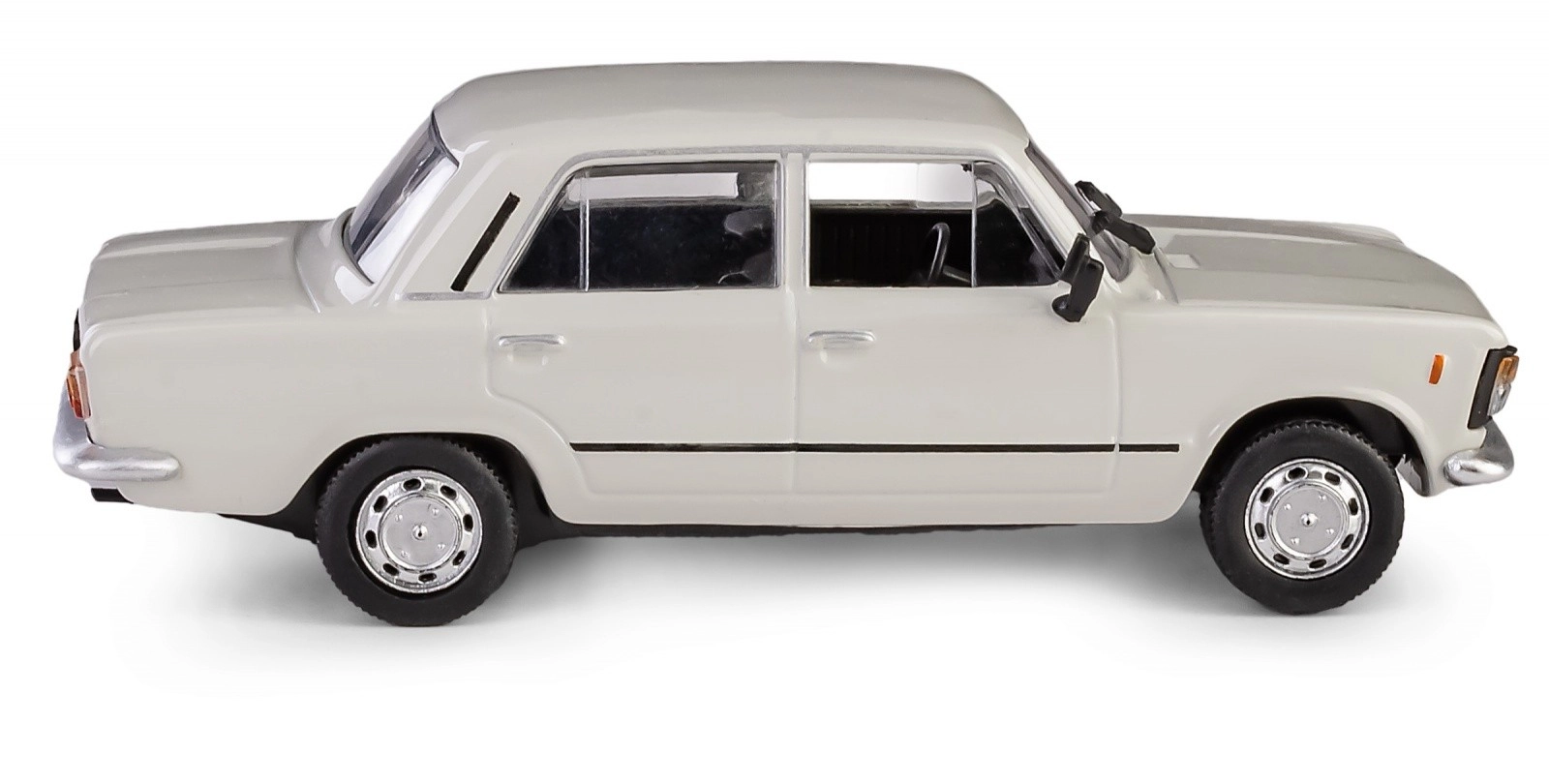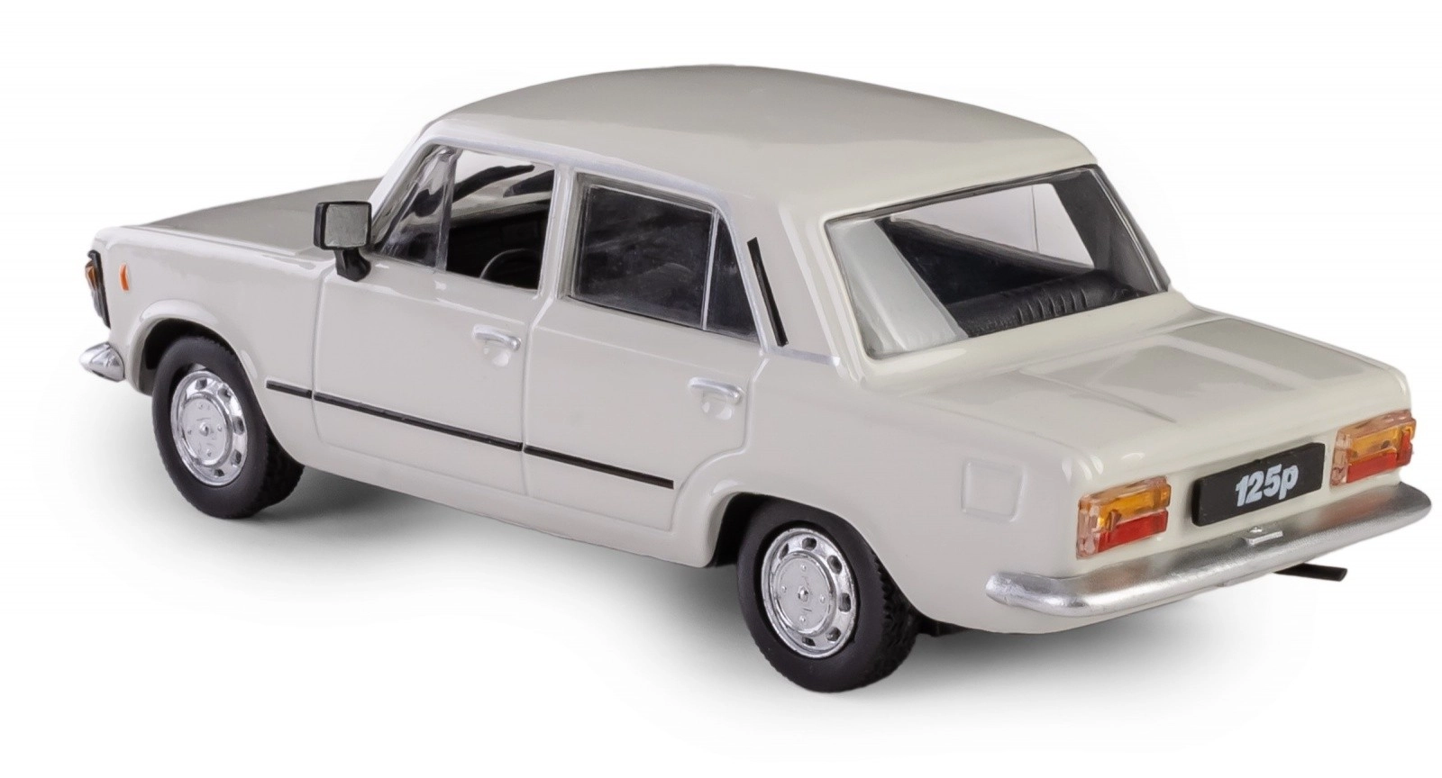 Ten autentyczny model bazuje na zmodernizowanej wersji MR’75 słynnego „dużego fiata”, później produkowanego jako FSO 125p. Wyróżnia się realistycznymi proporcjami, chromowanymi detalami zderzaków, precyzyjnie uformowanymi światłami oraz wnętrzem widocznym przez przejrzyste szyby. Popielaty lakier podkreśla klasyczny charakter auta.