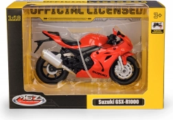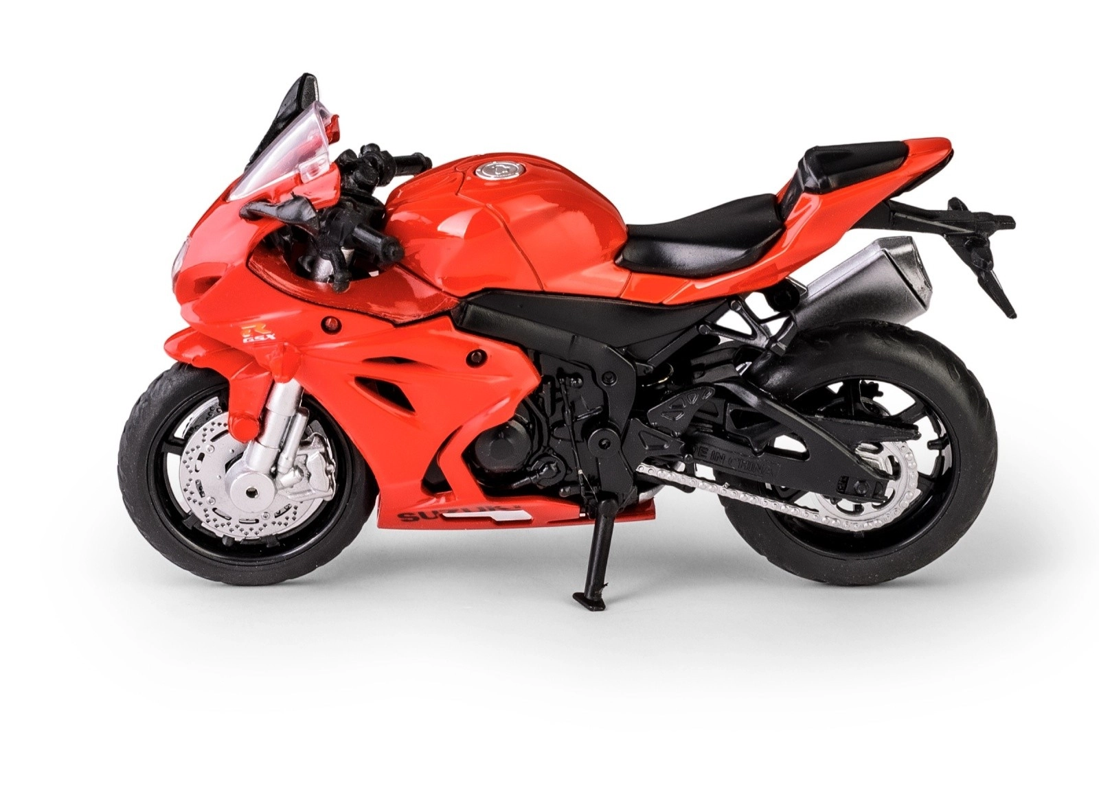 Detale karoserii, tarcze hamulcowe, wydech i lusterka odwzorowują prawdziwy SUZUKI GSX‑R1000. Idealny dla kolekcjonerów i jako dekoracja.