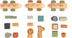 Ten drewniany pociąg z lokomotywą i dwoma wagonikami dostarcza dzieciom mnóstwo zabawy i nauki. Na bolce na podwoziach dzieci nakładają kolorowe elementy i budują własny pociąg, a urocze zwierzątka – żyrafa, słoń, miś, lew, hipopotam i krokodyl – jadą na wycieczkę. Zabawka wspiera rozwój umiejętności motorycznych, cierpliwości i koncentracji.