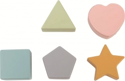 Pięć elementów do sortowania w atrakcyjnych kolorach pomaga dzieciom rozpoznawać kształty i barwy oraz ćwiczyć precyzję chwytu i percepcję przestrzenną.