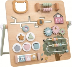Ta montessoriańska drewniana tablica motoryczna z motywami farmy oferuje dzieciom szeroką gamę interaktywnych elementów: obrotowe zębate kółeczka, przesuwne elementy, koralikowy i druciany labirynt, małe liczydło oraz klocki do sortowania kształtów. Wszystko jest przejrzyście rozmieszczone i wykonane z wysokiej jakości materiałów dla bezpiecznej i długotrwałej zabawy.