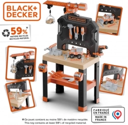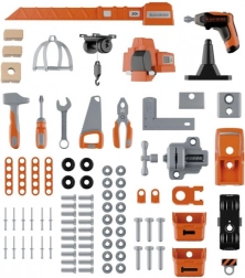 W zestawie znajduje się konstrukcyjny model auta, który mali mechanicy złożą w kilku krokach. Warsztat zawiera młotek, klucz do kół, śrubokręt, klucz płasko-oczkowy, szczypce, piłę, dużą śrubę zaciskową i suwmiarkę, a także śruby, nakrętki, gwoździe i elementy łączące. Kompatybilny i rozszerzalny ze wszystkimi narzędziami BLACK+DECKER marki Smoby.
