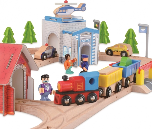 Ta dopracowana w detalach kolejka oferuje kompletny świat na torach: lokomotywę z wagonami, samochody, figurki, posterunek policji, lądowisko, drzewa i znaki drogowe. Dzieci mogą załadować towar, przejechać przez podwyższony most, zatrzymać się przy stacji i bezpiecznie pokonać przejazd ze szlabanami. Każda podróż zmienia się w nową historię i rozwija logiczne myślenie, koordynację ręka–oko oraz komunikację podczas wspólnej zabawy.