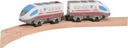 Nowoczesny szybki pociąg na baterie do drewnianych kolejek ucieszy każdego małego maszynistę. Stylowy niebiesko-biały zestaw z realistycznymi detalami, magnetycznym sprzęgiem i samodzielną jazdą oferuje mnóstwo akcji i rozwija małą motorykę, koordynację oraz wyo braźnię. Kompatybilny z większością standardowych drewnianych torów.